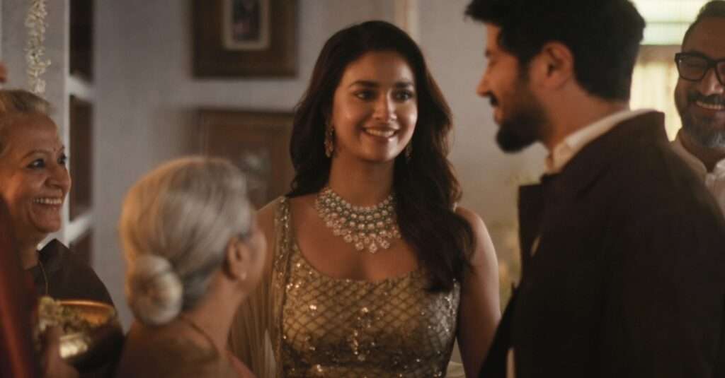 The film centres on a wedding that unfolds. Dulquer Salmaan brings a contemporary presence that feels assured, Keerthy Suresh adds familiarity drawn from today’s wedding narratives, while Suhasini Maniratnam lends depth shaped by lived experience. Together, they give the story a sense of balance and quiet conviction. Jewellery appears as it always has at such moments, present without announcement, becoming part of how the occasion takes form.