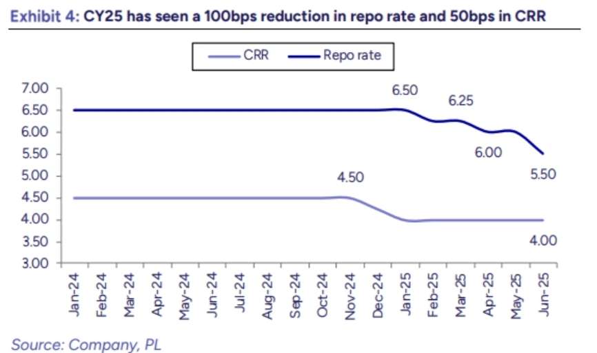 In the first quarter, government capital expenditure was front-loaded, recording impressive growth of 61% in April and 39% in May, supported by strong momentum in new project orders and a significant increase in defense spending. At the same time, the Reserve Bank of India reduced the repo rate by 100 basis points and announced a phased 100 basis point cut in the cash reserve ratio (CRR). These policy moves are intended to enhance system liquidity and stimulate credit growth, which reached a moderate 9.5% in Q1 FY26.