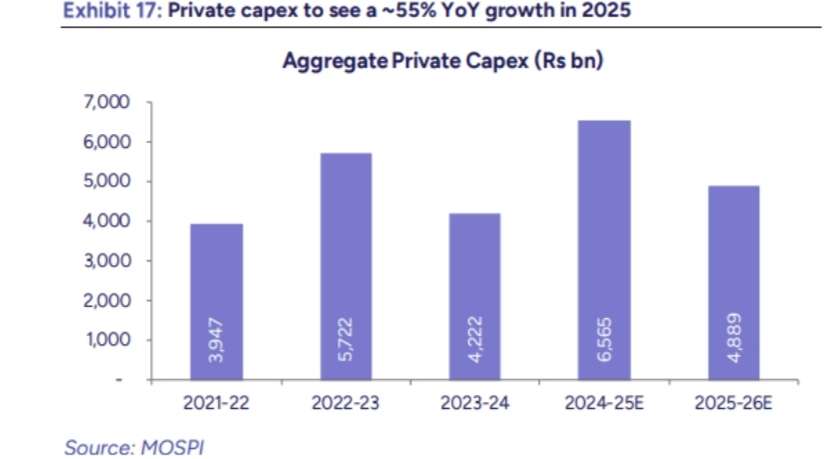 Private sector capital expenditure in India is projected to rise sharply by ~55% year-on-year to ₹6.6 trillion in 2025. Between 2022 and 2026, private capex is expected to grow at a robust CAGR of ~24%, largely driven by manufacturing, which is set to comprise around 43.8% of total private capex in 2025. This strong investment momentum, together with sustained public capex, is likely to boost order inflows for capital goods companies within our coverage universe